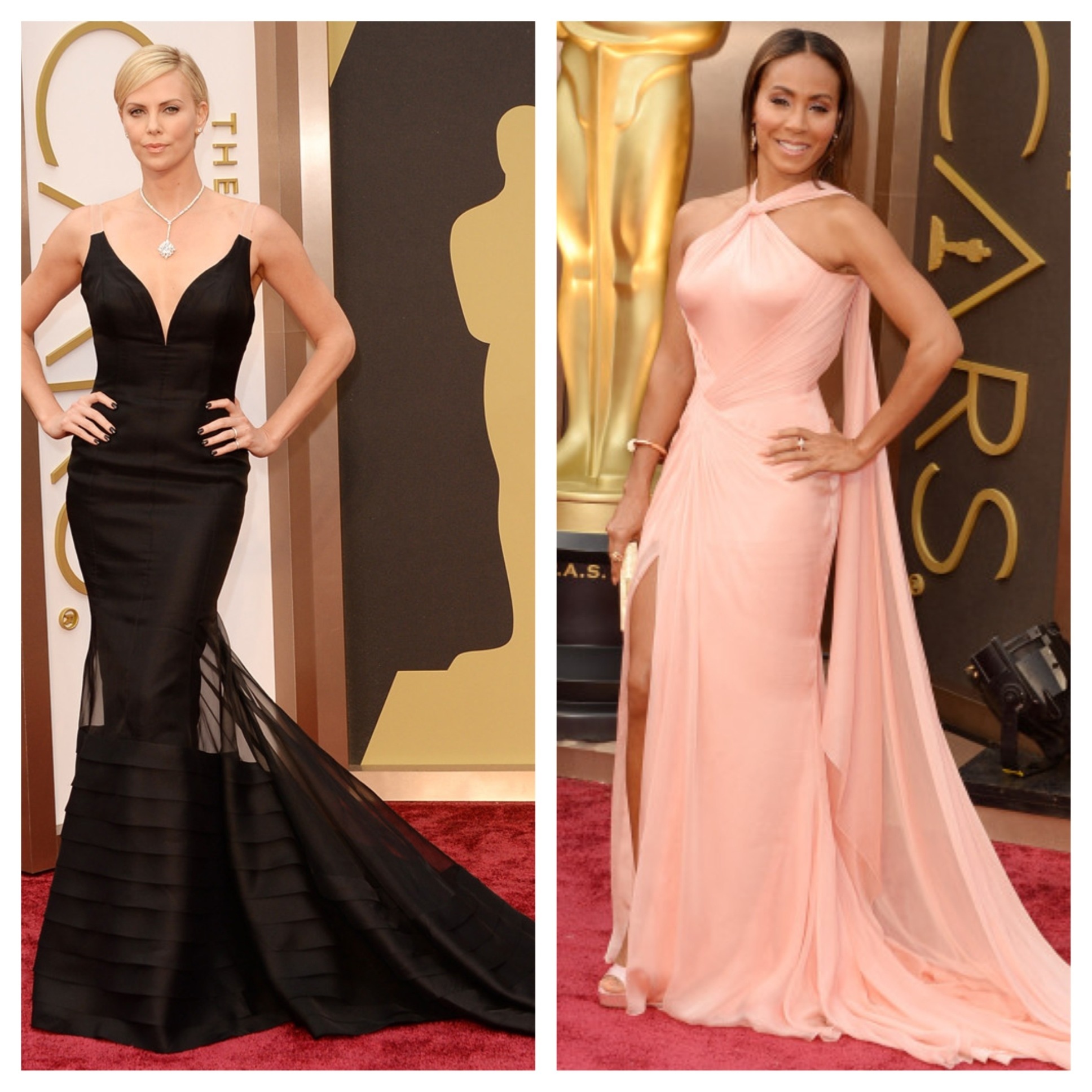 Charlize Theron looks great in this black Dior number with the sheer straps and Jada Pinkett-Smith is glowing in coral Versace.